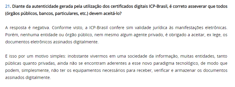 Ou seja, apesar de a MP 2002 autorizar o uso de assinatura digital para documentos eletrônicos no Brasil, esse não necessariamente pode ou deve ser aceito por um determinado órgão, empresa ou setor, sem uma regulamentação específica.