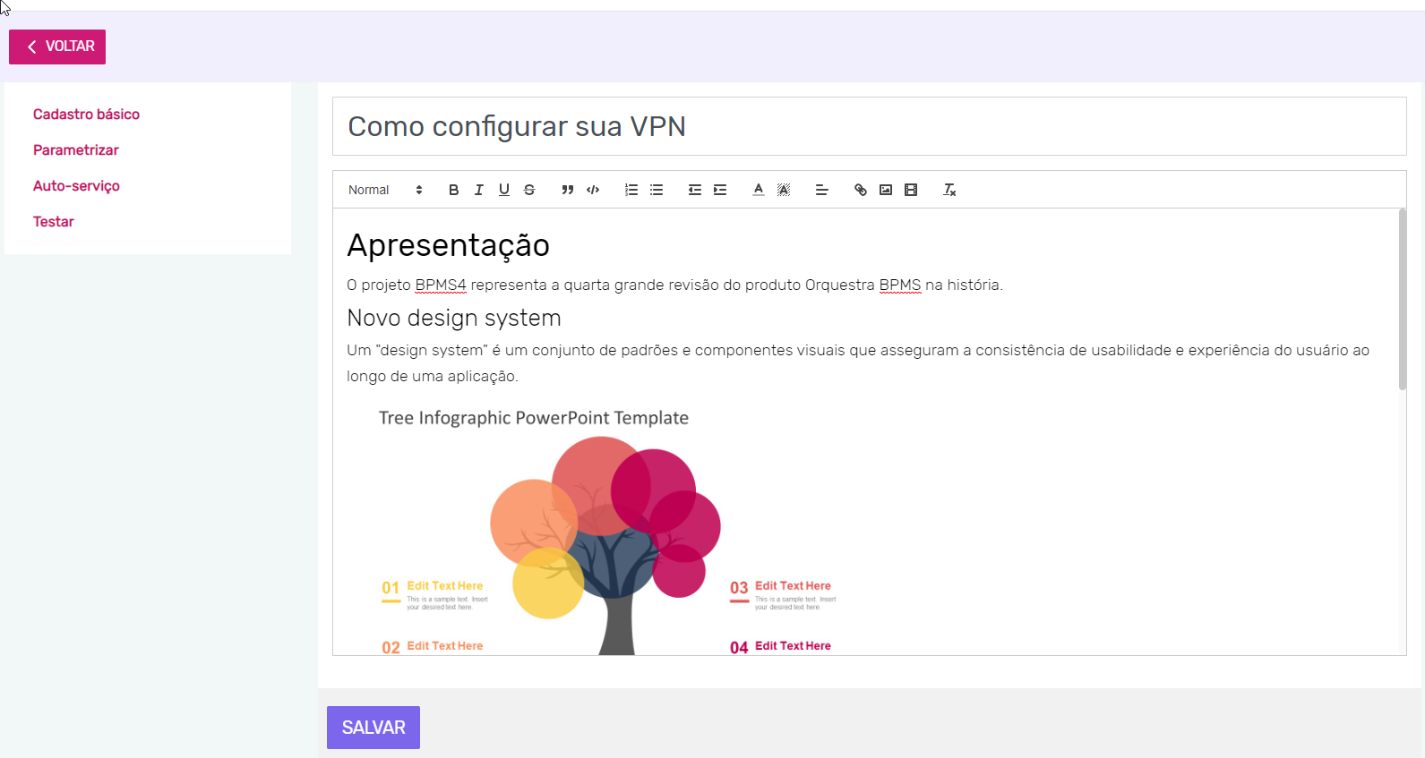 Vinculado a cada serviço, é possível escrever documentações, politicas, tutoriais, FAQs, procedimentos de auto-atendimento ou qualquer outro tipo de conteúdo rico.