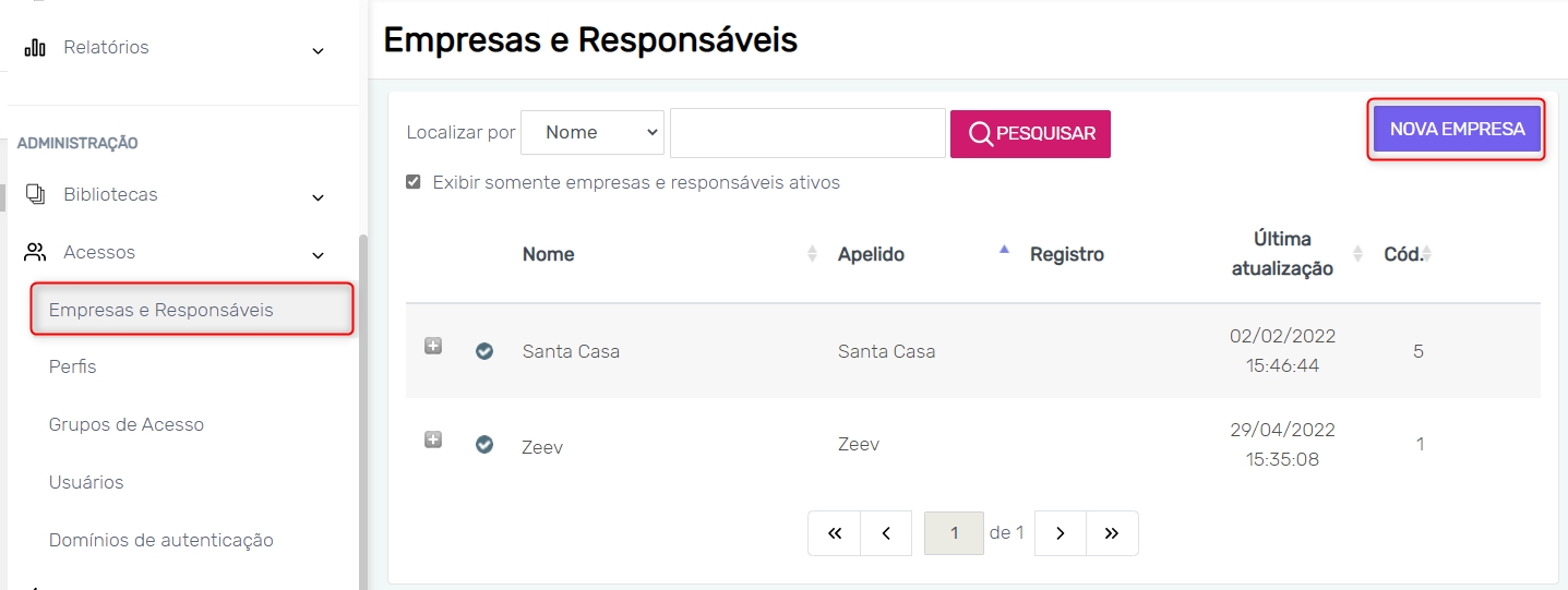 No menu "Acessos" do Zeev docs, acesse o módulo "Empresas e responsáveis" para criar uma empresa.