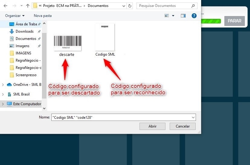 Observe que foi criado um documento a partir do arquivo que possui o código habilitado para reconhecimento (que inicia com o valor "SML"). O documento que contém o código de barras REMOVE, foi descartado com seus arquivos e não será armazenado na biblioteca após o encerramento: