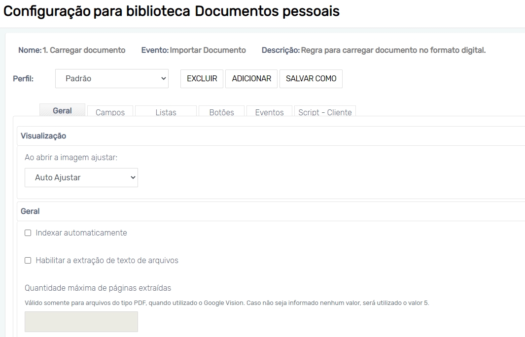 Na aba Geral é possível configurar o ajuste na visualização das imagens importadas, indexar automaticamente e habilitar a extração de documentos: