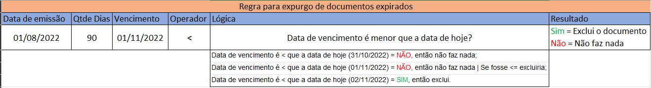 O resultado da seguinte soma: Data de emissão + a quantidade de dias, definido na regra, é menor ou igual à data de hoje? Se o resultado for negativo, então nenhuma ação é realizada. Se for positivo, quer dizer que o documento já venceu e a ação pode ser realizada.