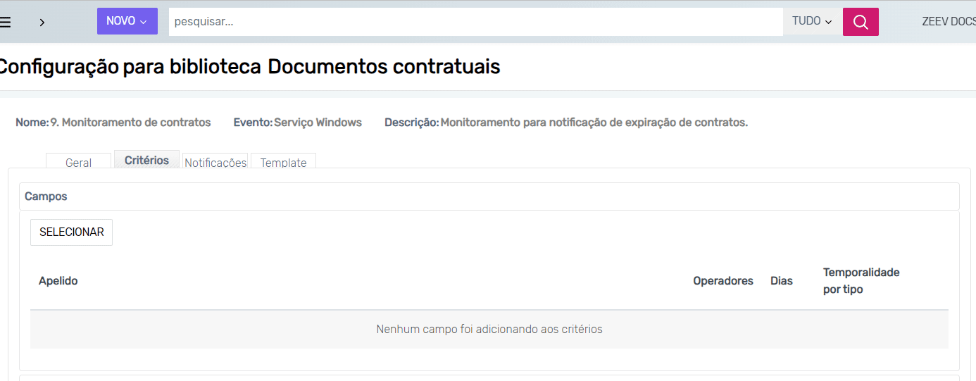 Na aba Critérios é possível configurar os critérios da regra para realizar alguma ação.