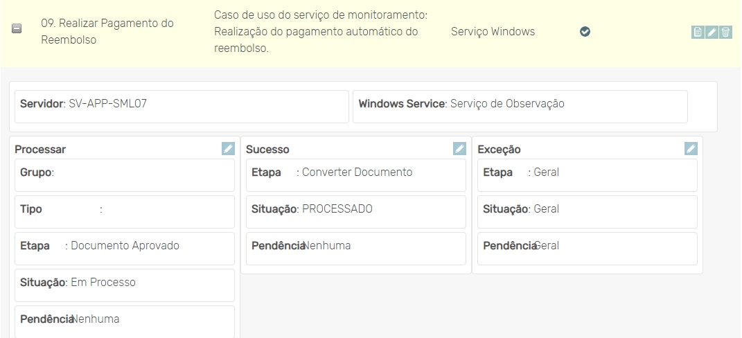 Para essa regra de negócio funcionar, é obrigatório configurar as etapas, situações e pendências do Processamento, Sucesso e Exceção.