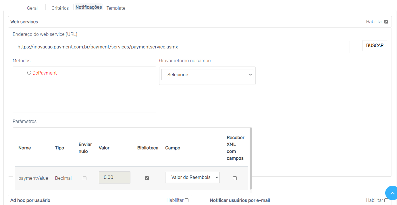 Na aba Notificações, caso os critérios sejam atendidos, é possível configurar para: