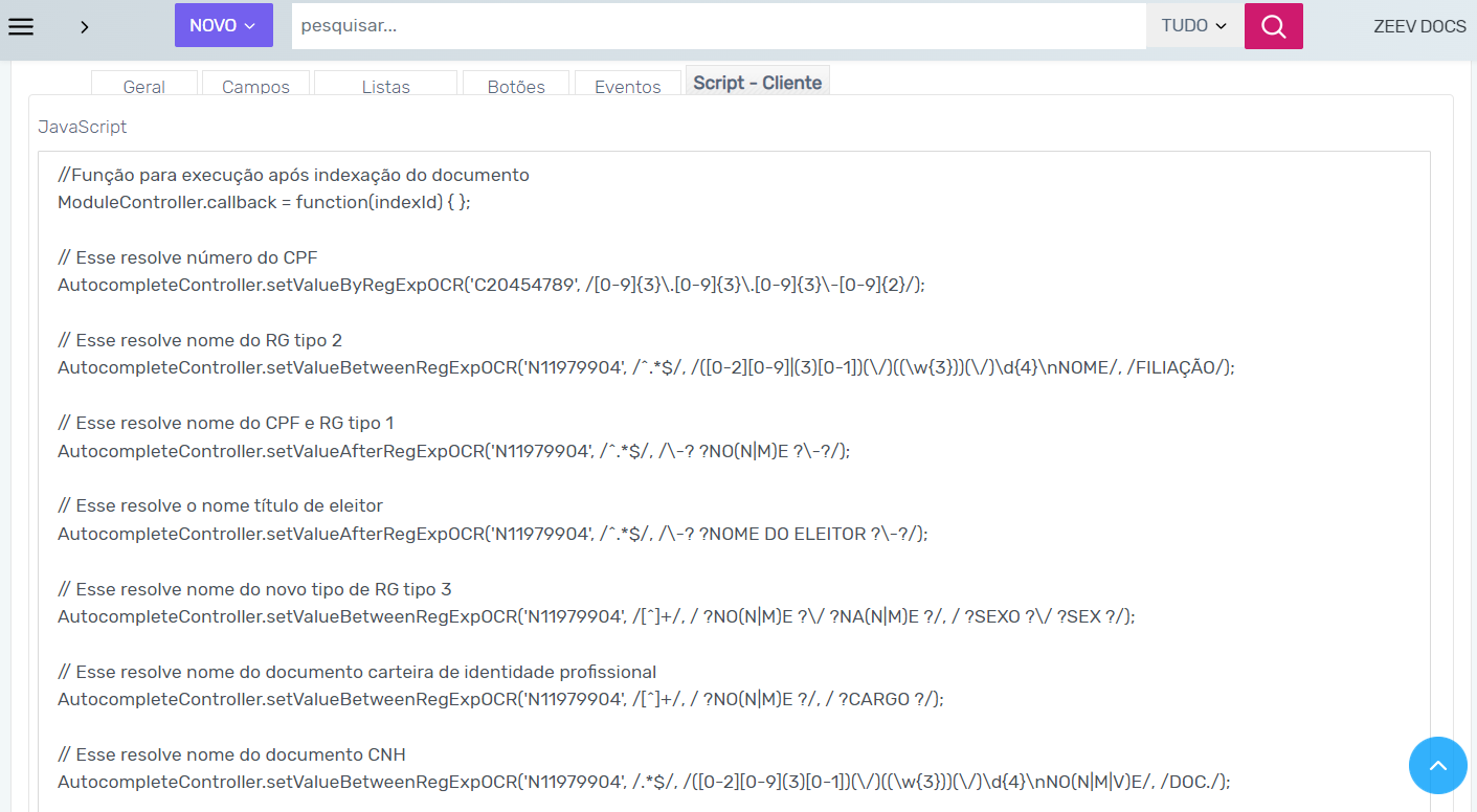 Para fazer uso dessa funcionalidade, o OCR deve estar habilitado para o módulo Carregar documento, você também precisará acessar as configurações desse módulo para adicionar as chamadas de funções que serão executadas para auto preencher os campos. Essas chamadas devem ser adicionadas na aba "Scripts - Cliente".