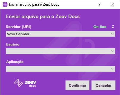 Será carregado um pop-up do Zeev docs. Preencha o servidor(URL do seu ambiente), selecione o usuário e a biblioteca.