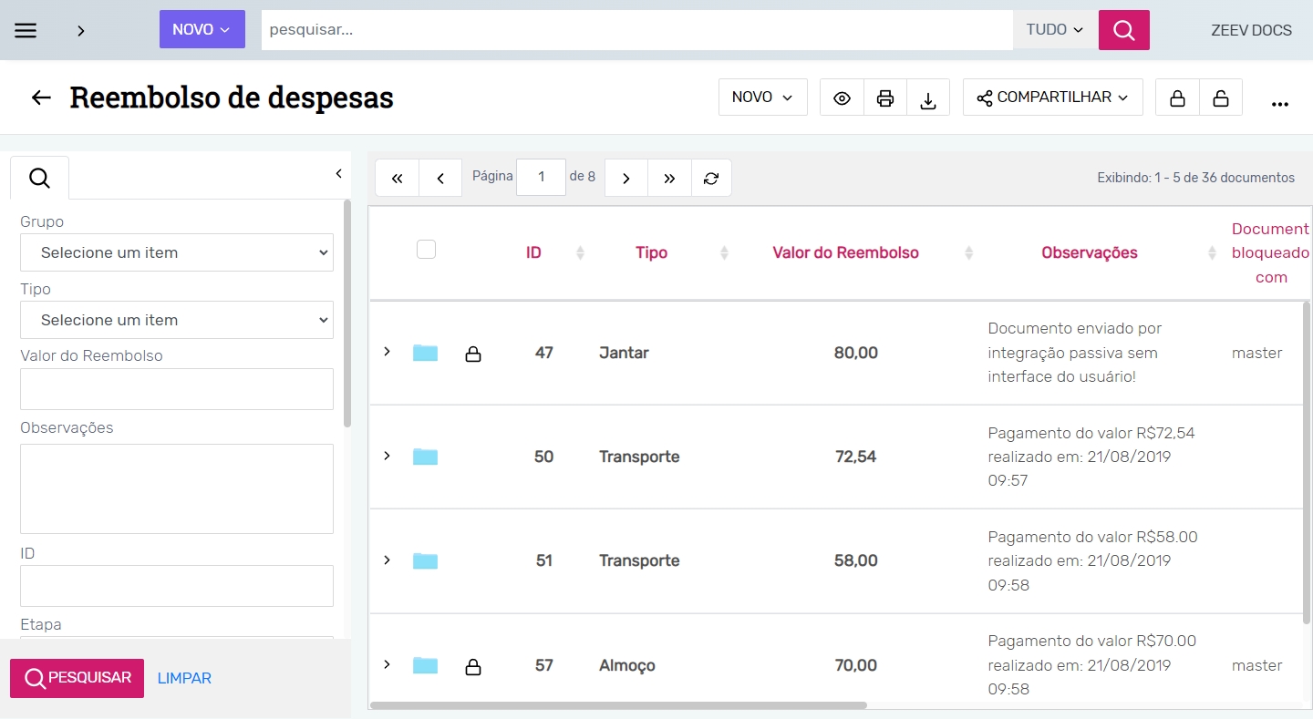 Ao acessar uma biblioteca é possível consultar todos os documentos armazenados. Também é possível utilizar filtros de pesquisa para localizá-los.