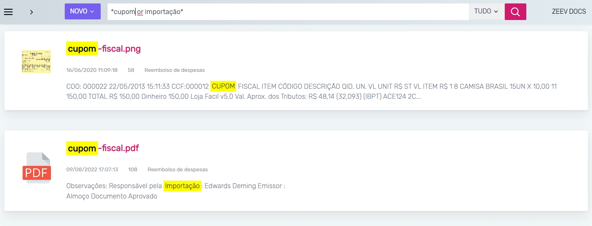 Por exemplo, uma busca que utilize o termo "responsável importação", irá exigir que o resultado encontre documentos que possuam as duas palavras em algum dos seguintes locais: conteúdo do arquivo, campos da biblioteca ou no nome do arquivo. Será apresentado o resultado caso algum desses 3 locais possuam as duas palavras.