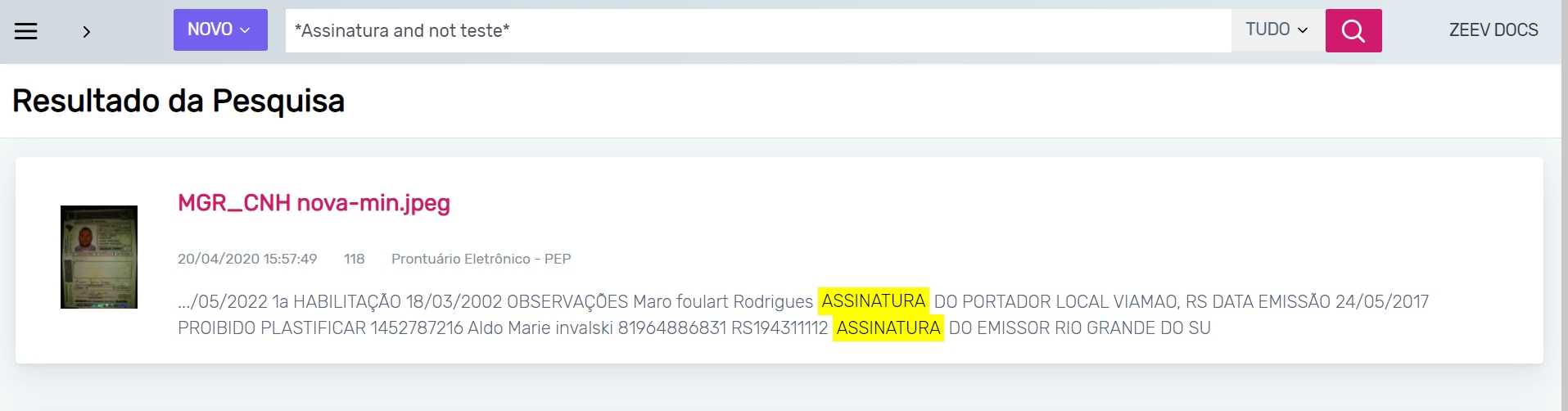 Para realizar buscas utilizando uma frase, coloque-a entre aspas, como "Assinatura do paciente". Em primeiro lugar, serão apresentados os documentos que contenham exatamente a frase. Além disso, também serão apresentados resultados que contenham um ou mais termos que foram pesquisados, mesmo que não estejam na ordem de preenchimento.