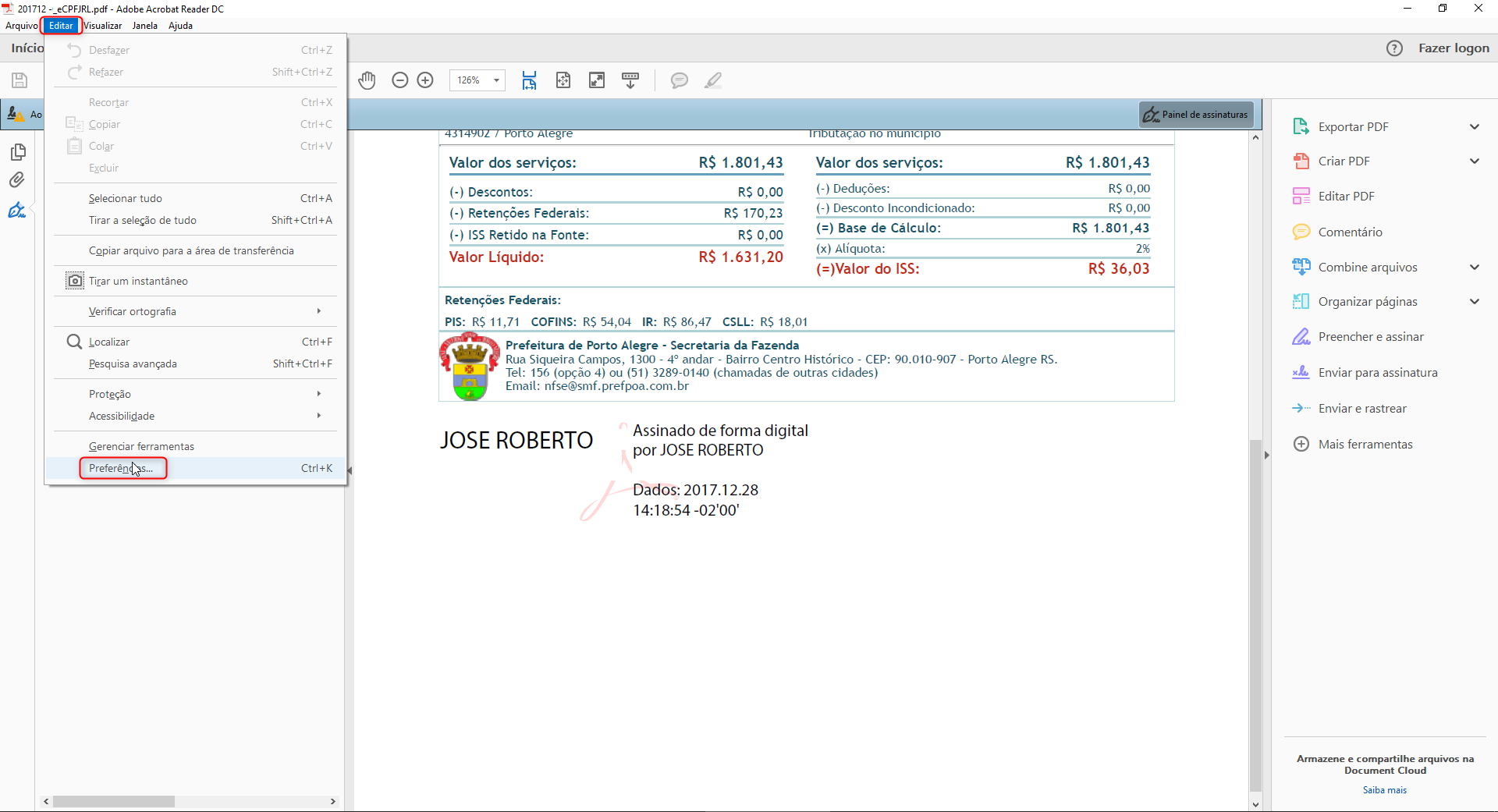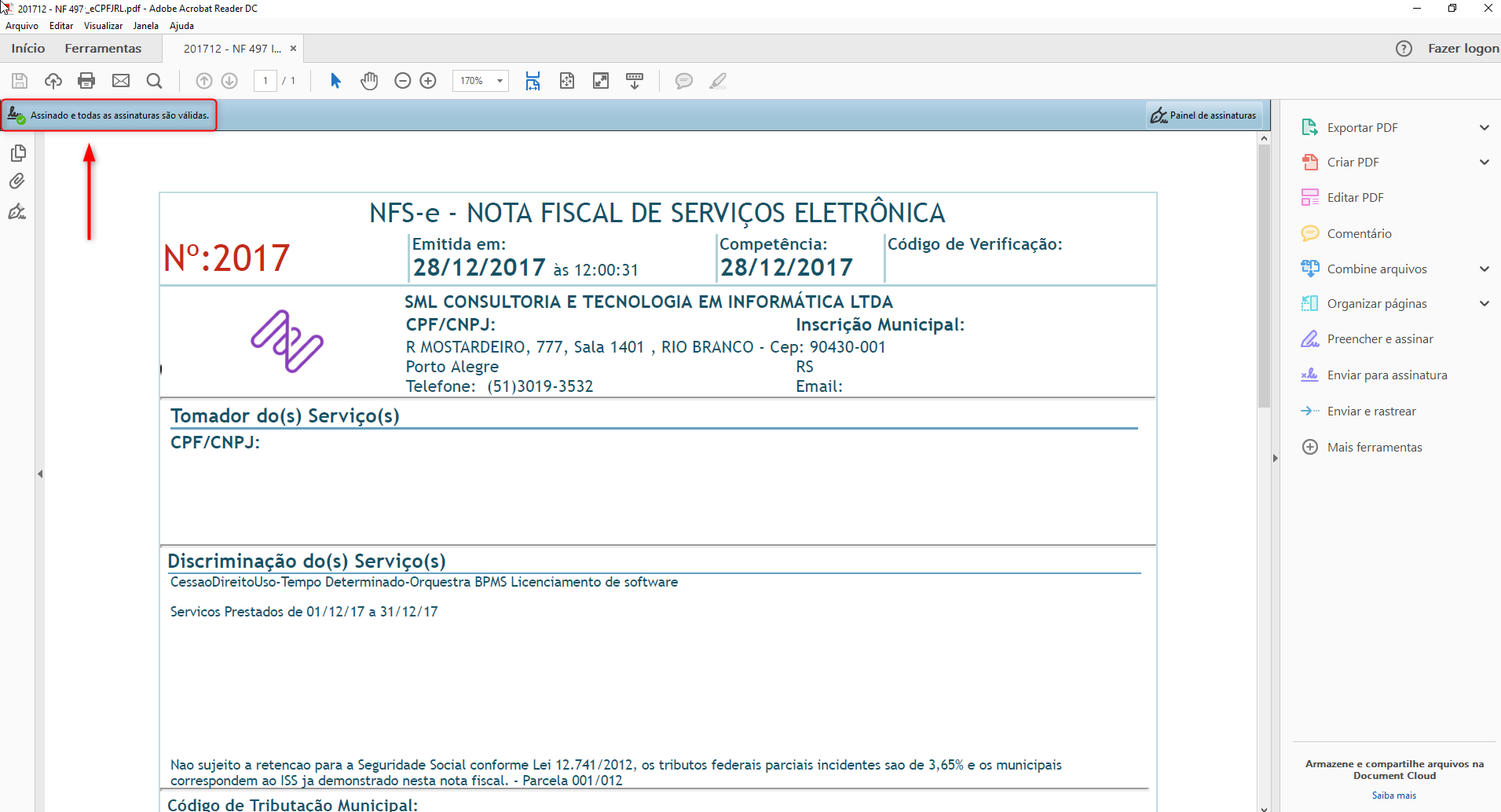 Feche e abra novamente o Adobe Reader. Após realizar esse procedimento, o documento apresentará a assinatura como válida: