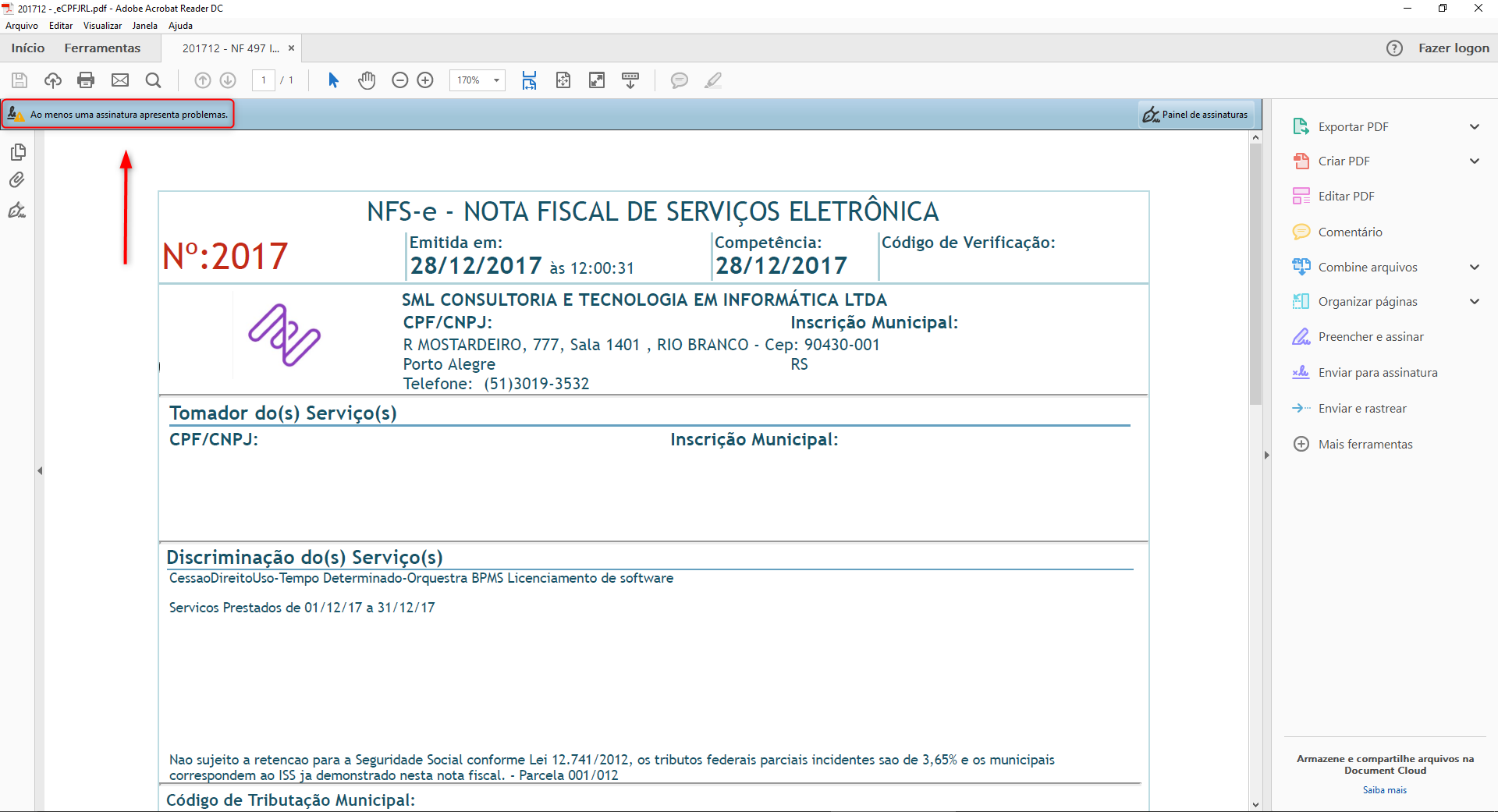 Ao abrir o arquivo no Adobe Reader, será exibida uma mensagem informando que ao menos uma assinatura apresenta problemas: