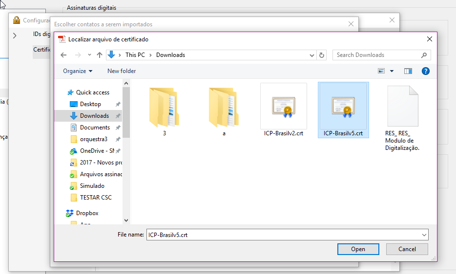 Acesse o site do ITI (http://iti.gov.br/repositorio/repositorio-ac-raiz) e efetue o download da versão desejada do certificado AC Raiz do ICP-Brasil. Em seguida, retorne para a janela do Adobe Reader que está aberta e selecione o arquivo .CRT que acabou de ser baixado: