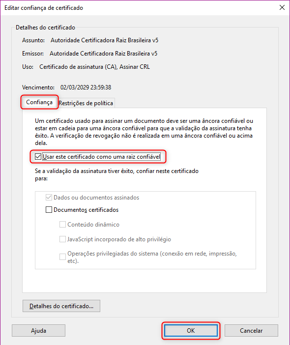 Escolha a aba "Confiança". Em seguida, selecione a opção "Usar este certificado como uma raiz confiável":