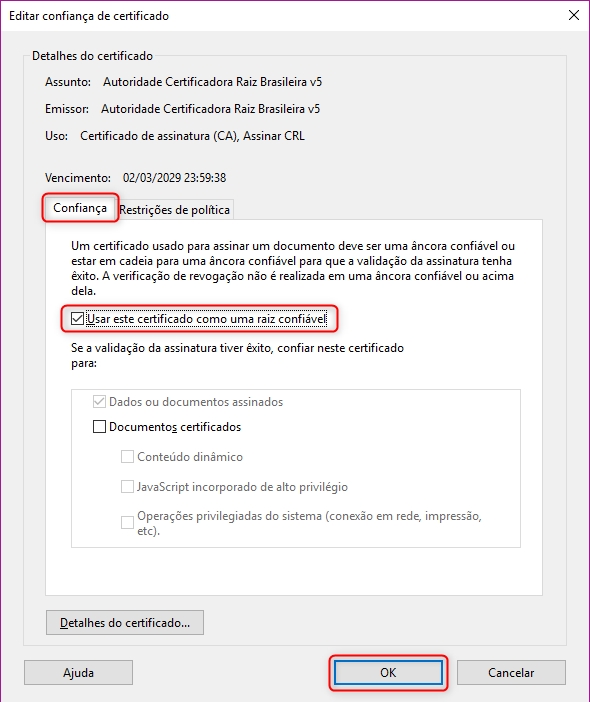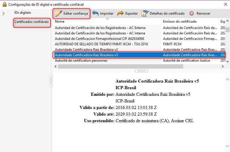 Retorne para a tela de configurações. Escolha a opção "Certificados confiáveis" (à esquerda). Posteriormente, selecione o certificado da Autoridade Certificadora Raiz Brasileira que acabou de ser importado e clique no botão "Editar confiança":