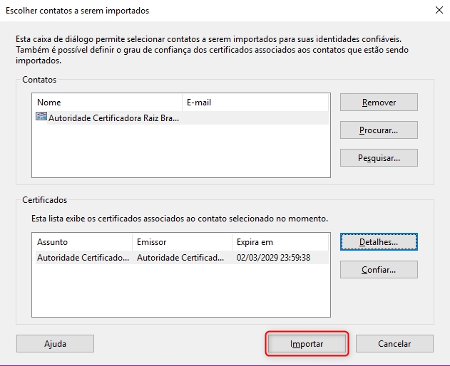 Verifique os dados do certificado que será importado. Em seguida, clique no botão "Importar":