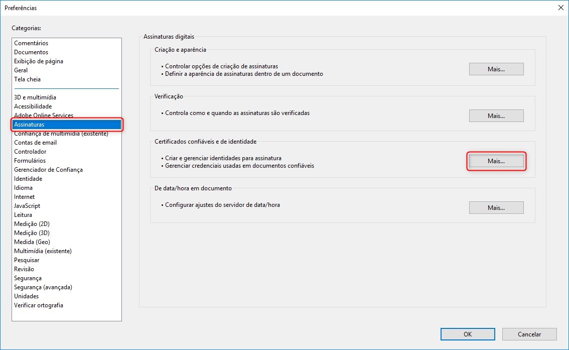 Serão apresentadas as Preferências do programa. Escolha a opção "Assinaturas" e na seção "Certificados confiáveis e de identidade" clique no botão "Mais":