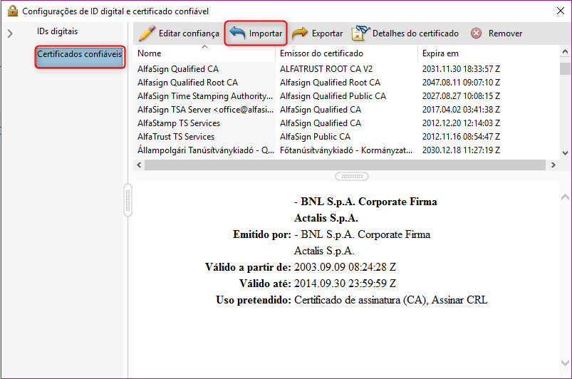 No menu da esquerda, clique em "Certificados confiáveis". Em seguida, clique em "Importar":
