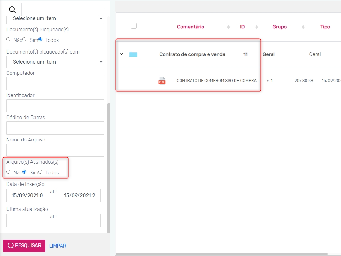 Ao selecionar Sim, serão listados os documentos onde em que ao menos um arquivo possua assinatura digital.