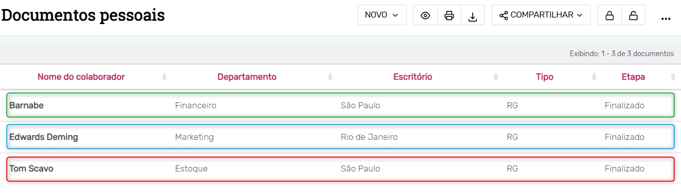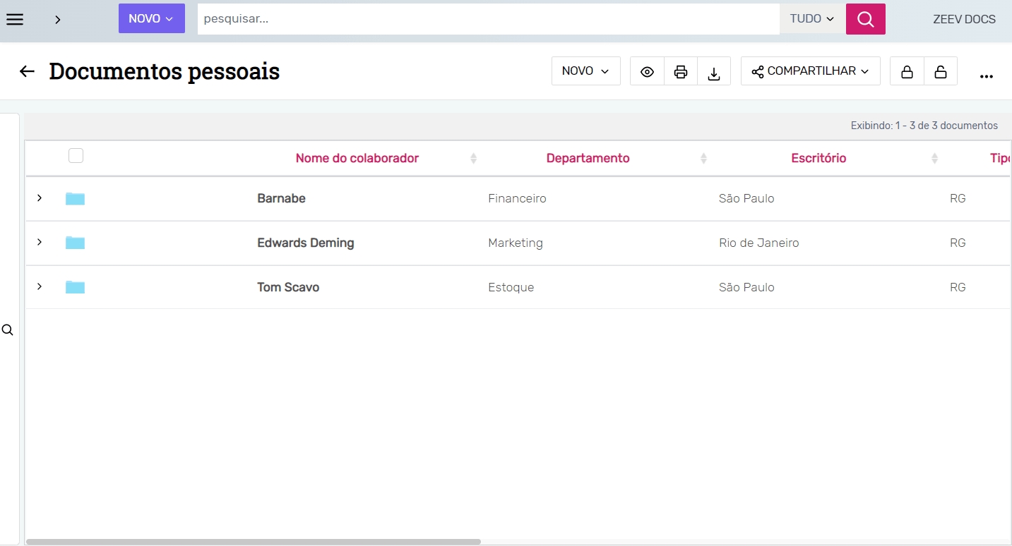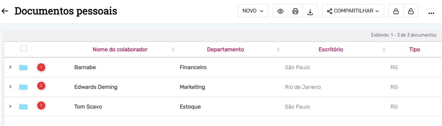Cada linha apresentada no resultado de uma busca representa um documento, no exemplo abaixo é apresentado 3 documentos na biblioteca "Documentos pessoais":