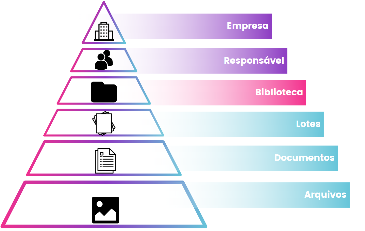 Documentos: contém um conjunto de arquivos. Um exemplo de documento seria um contrato, que possui diversas páginas (diversos arquivos).