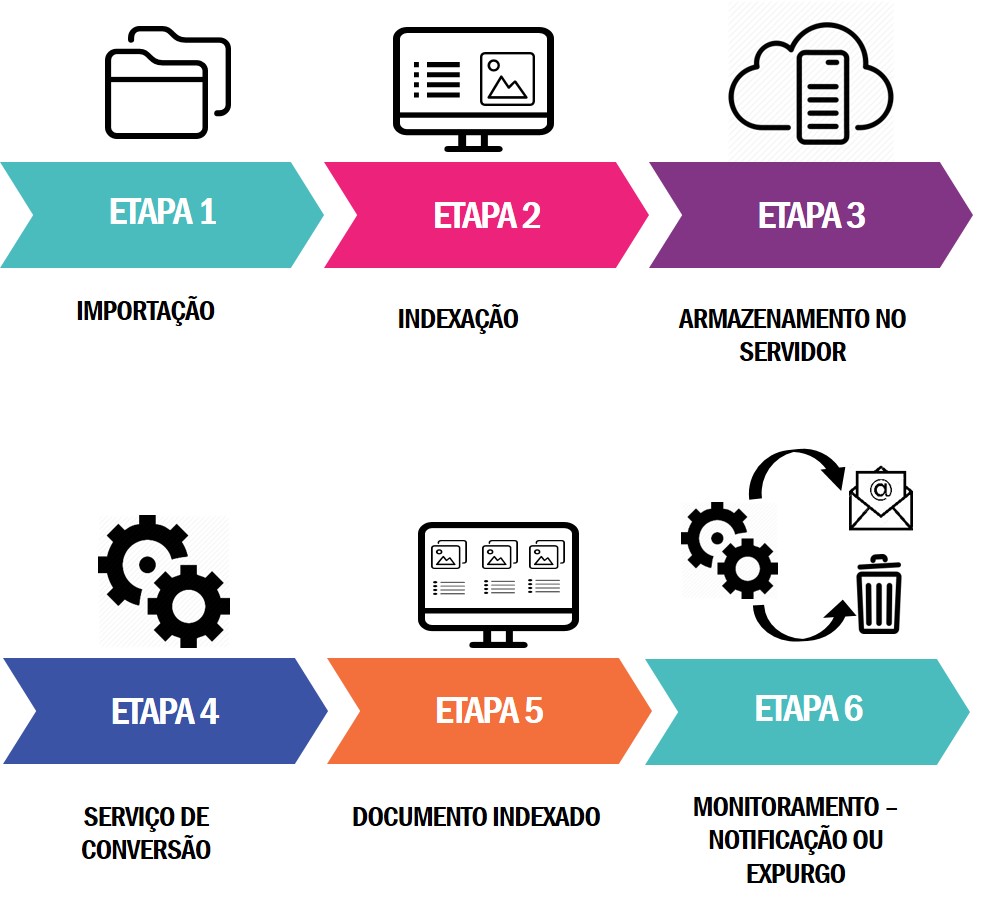 Etapa 6 - Monitoramento - Notificação ou expurgo: é possível que os documentos incluídos em uma aplicação sejam monitorados continuamente. Esse monitoramento pode ter fins diversos, mas os principais podem incluir o envio de e-mail aos responsáveis pela verificação manual de documentos que possuem informações erradas ou documentos que devem ser excluídos devido à sua temporalidade. Caso um documento tenha atingido a temporalidade (ou seja, o prazo que deve permanecer armazenado), a própria ferramenta efetuará o seu expurgo (exclusão permanente).
