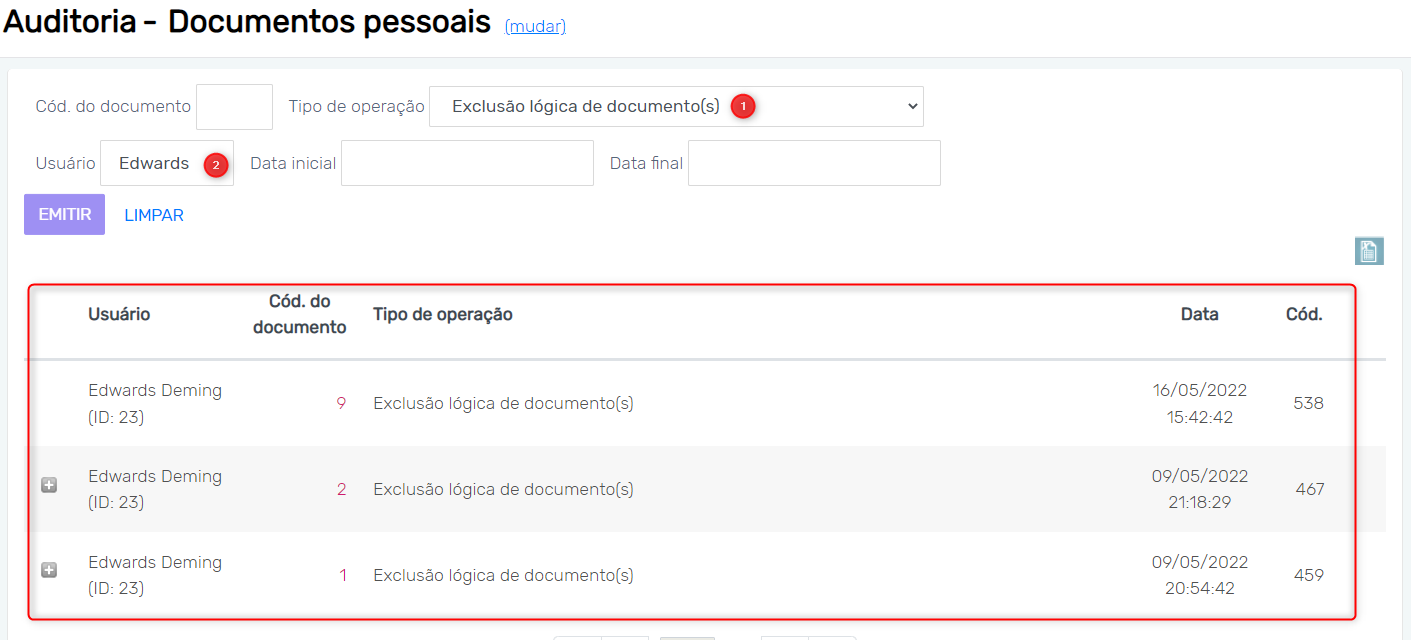 Os resultados apresentados podem ser exportados para uma planilha Excel, e alguns deles podem conter informações adicionais, permitindo o redirecionando para o documento modificado ou apresentando os detalhes dos campos alterados.