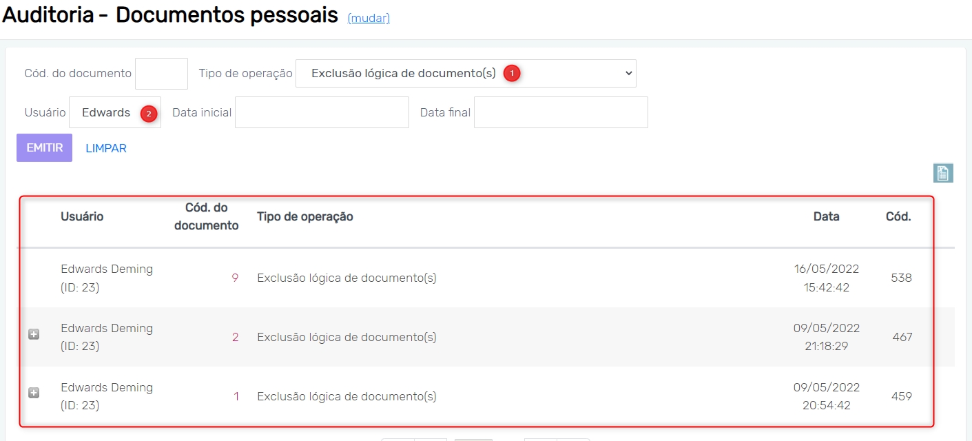 Registra todas as vezes que for realizada a Consulta de documentos, assim como quais filtros foram aplicados.