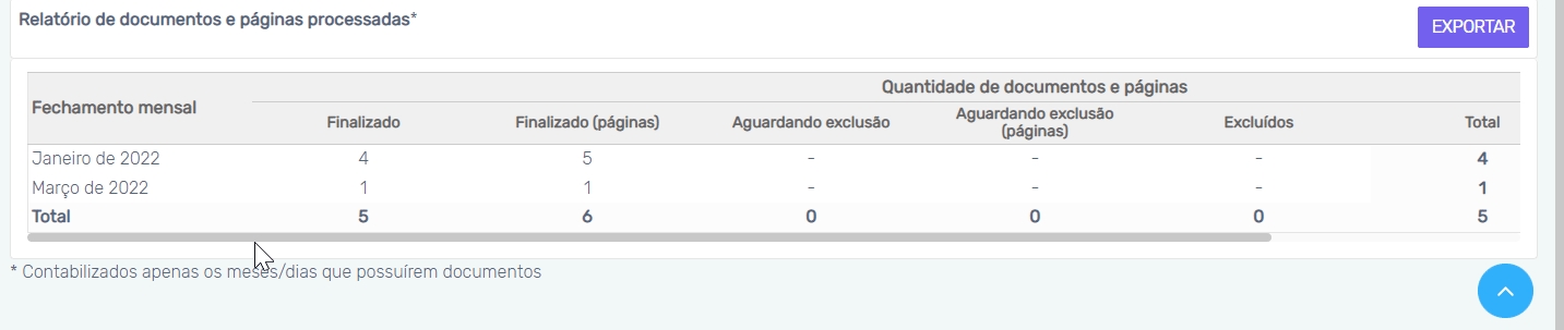 Se um documento foi importado em abril, mas foi reindexado em maio, o arquivo reindexado irá compor o total do mês de maio.