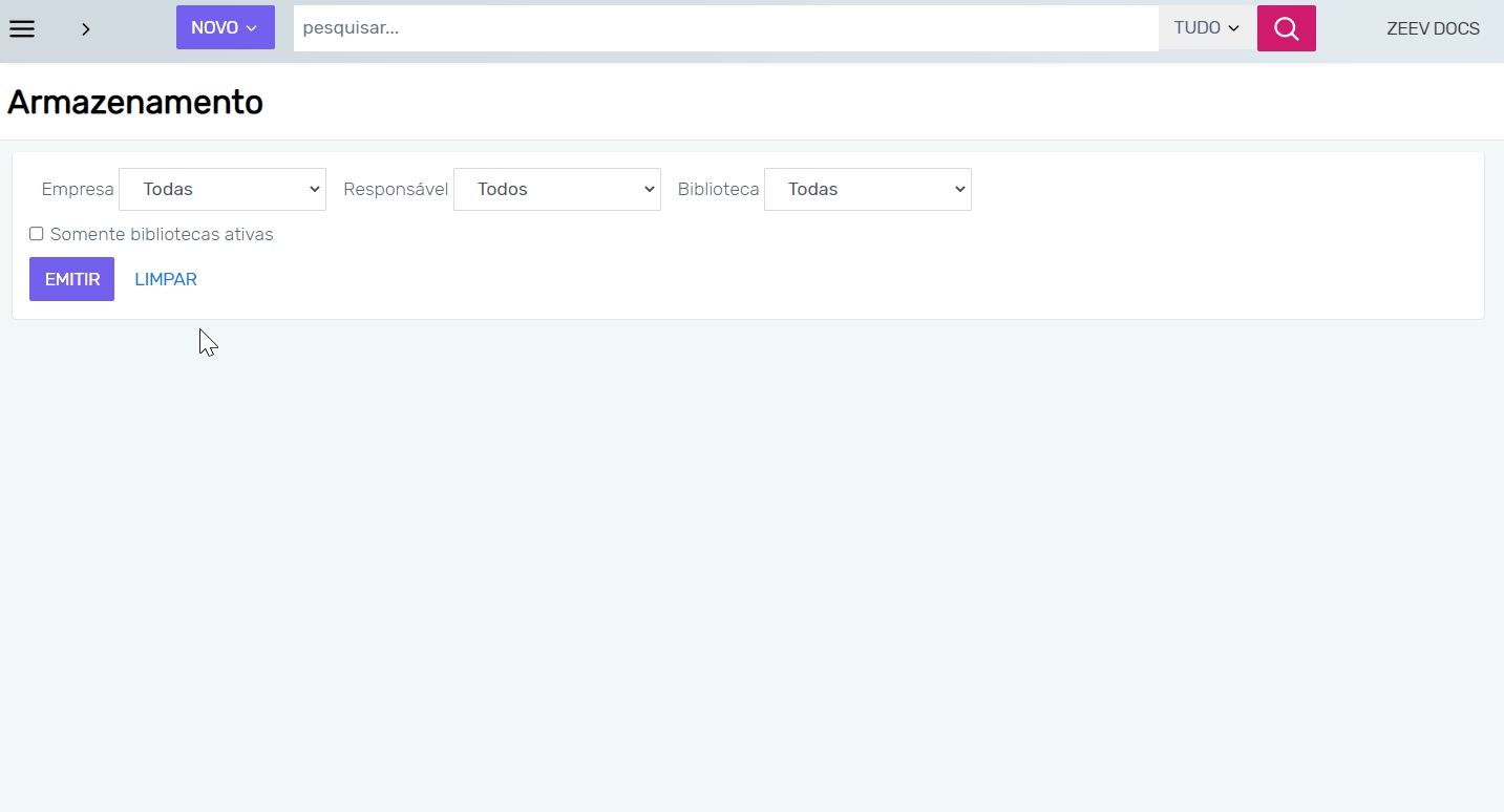 O relatório de armazenamento apresenta informações sobre o volume de documentos, arquivos, versões de arquivos e dados, separados por biblioteca.