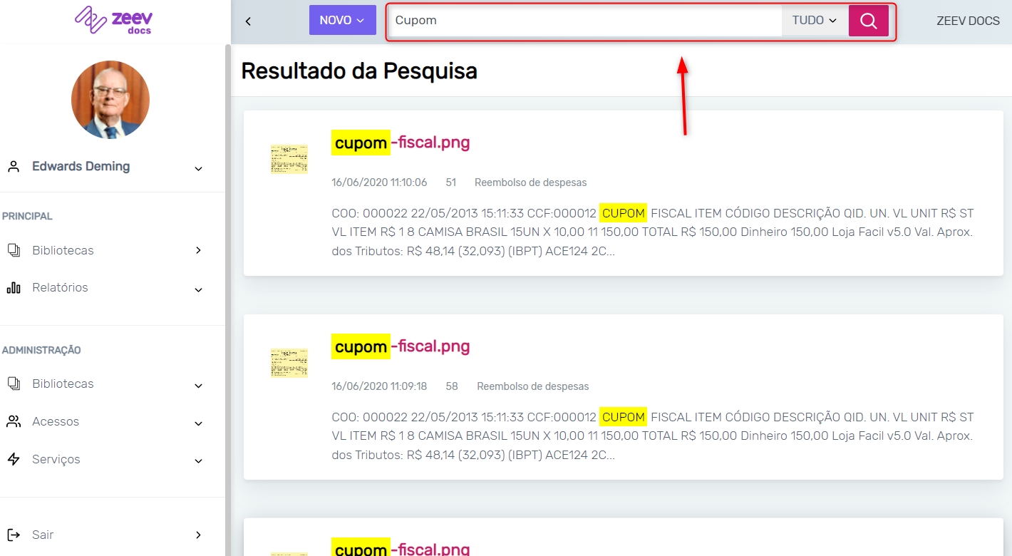A funcionalidade de pesquisa global apresenta um relatório próprio, disponível pessoas com permissões avançadas, permitindo o acompanhamento das pesquisas/tempos de execuções realizadas no Zeev docs.