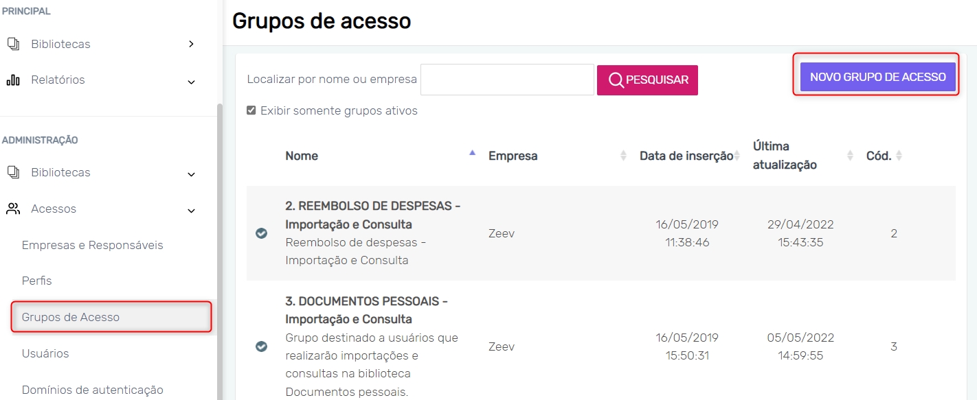 No menu "Acessos" do Zeev docs, acesse o módulo "Grupos de acesso" para criar um grupo.