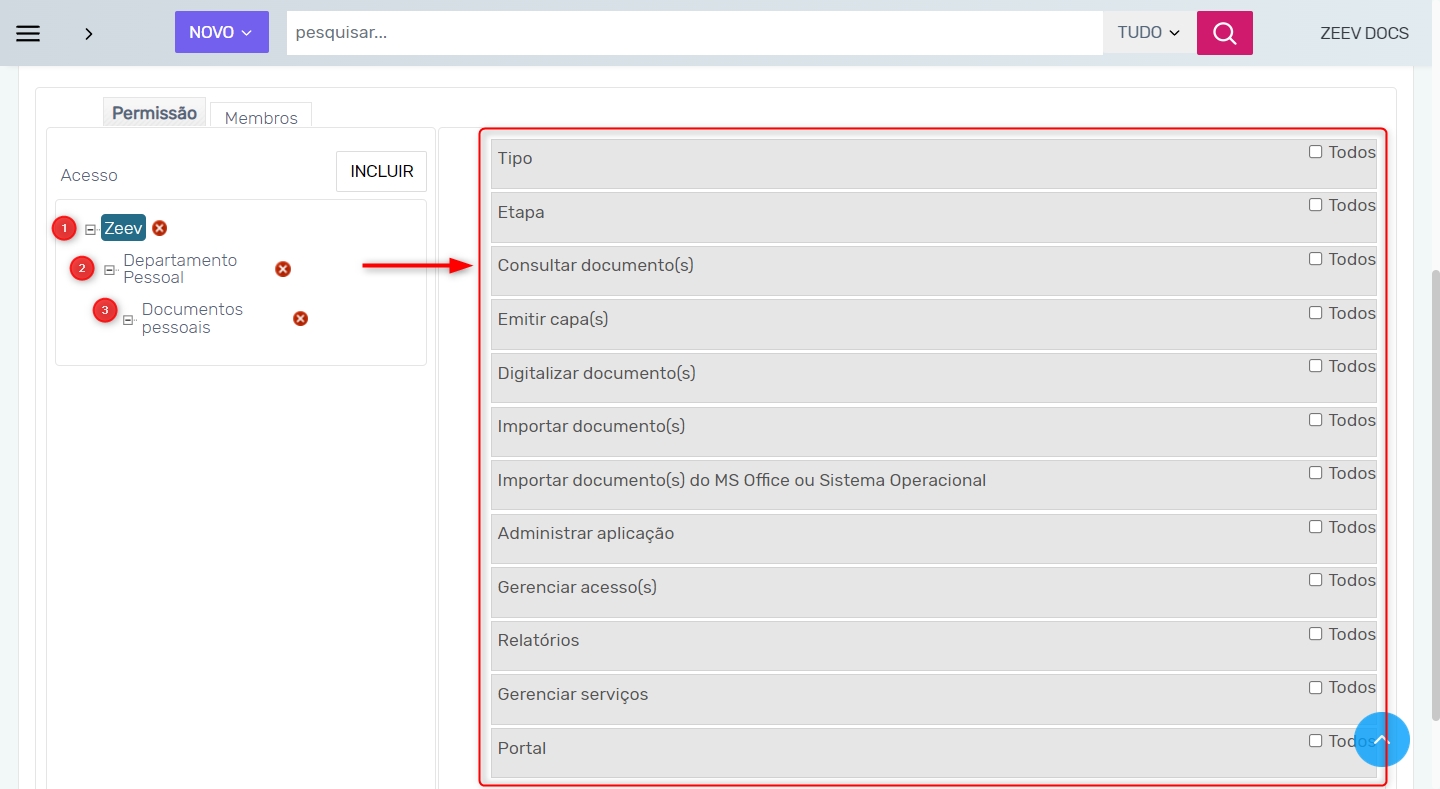 Departamento pessoal (responsável): esse segundo nível é o do responsável, ou seja, ao selecioná-lo e marcar as permissões na lateral direita, os membros desse grupo terão acesso aos módulos e funcionalidades de TODAS as bibliotecas abaixo exclusivamente deste responsável. Se a empresa Zeev tiver outro responsável, os usuários não terão acesso a essas bibliotecas.